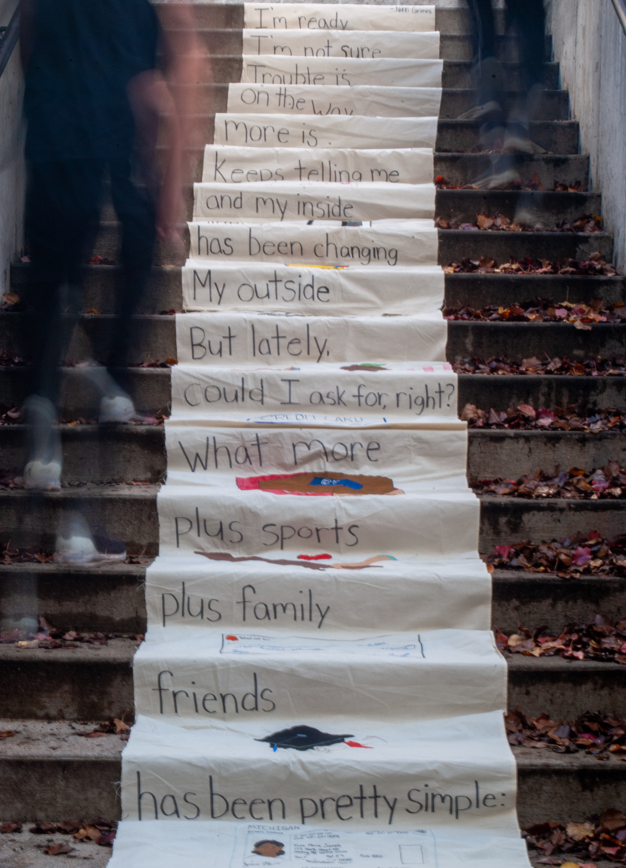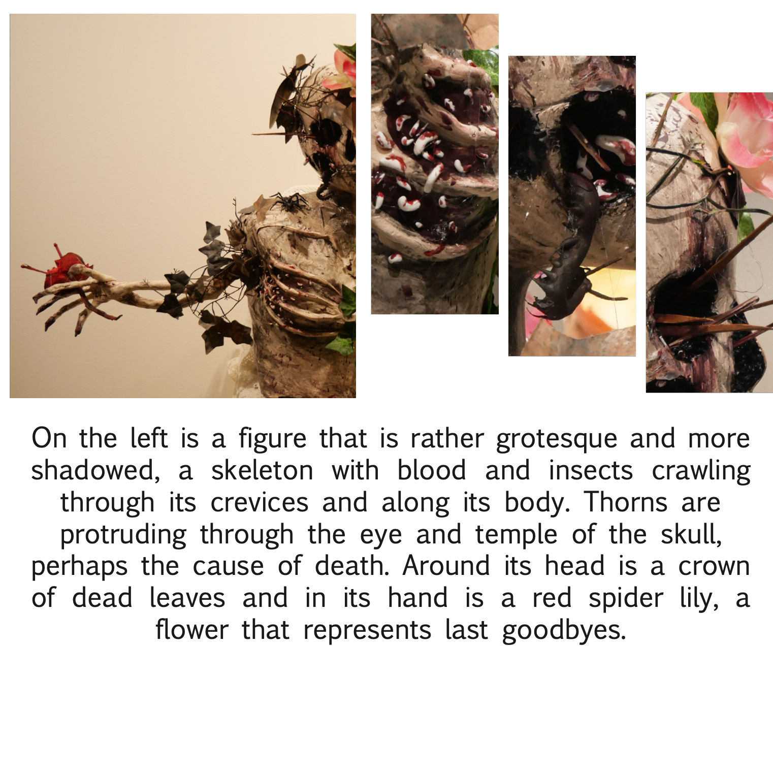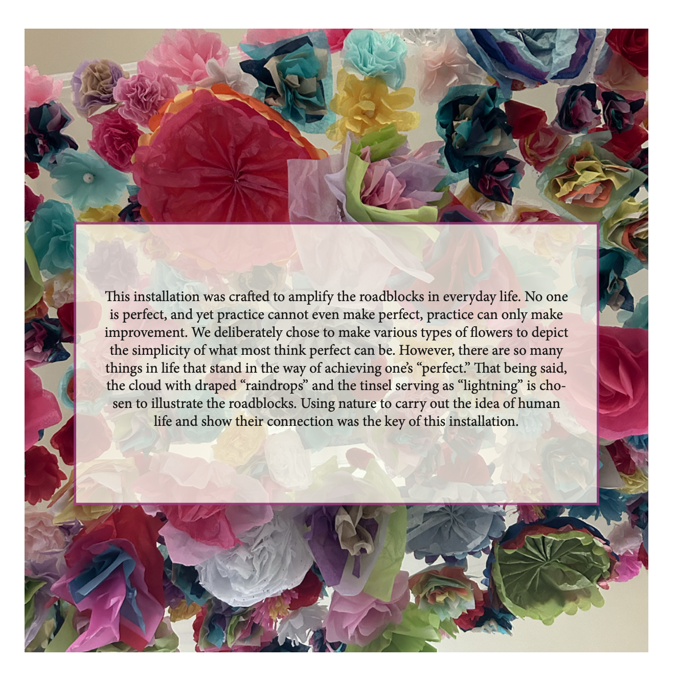 - Installation and group work – There is a huge benefit in learning how to work with other people. As we enter the work force we often have to collaborate or work with others [whether we are in business or in art]. This project also allows students to see the importance of space, lighting, and the importance of choosing the correct space for their design or concept so it can speak to what they intend.
